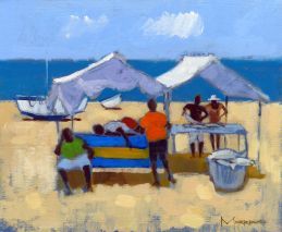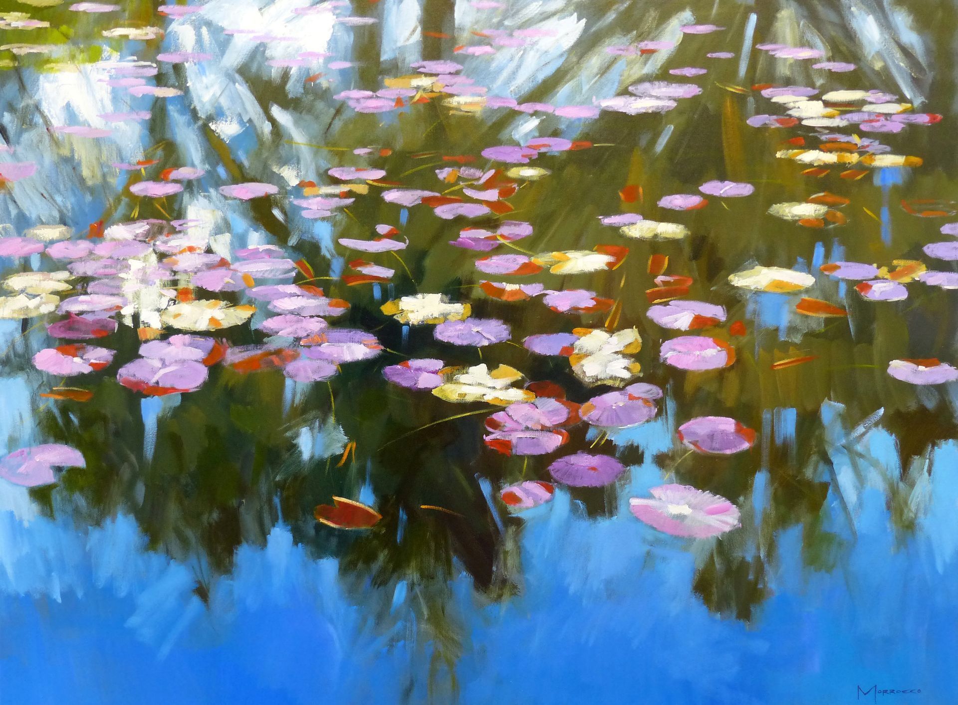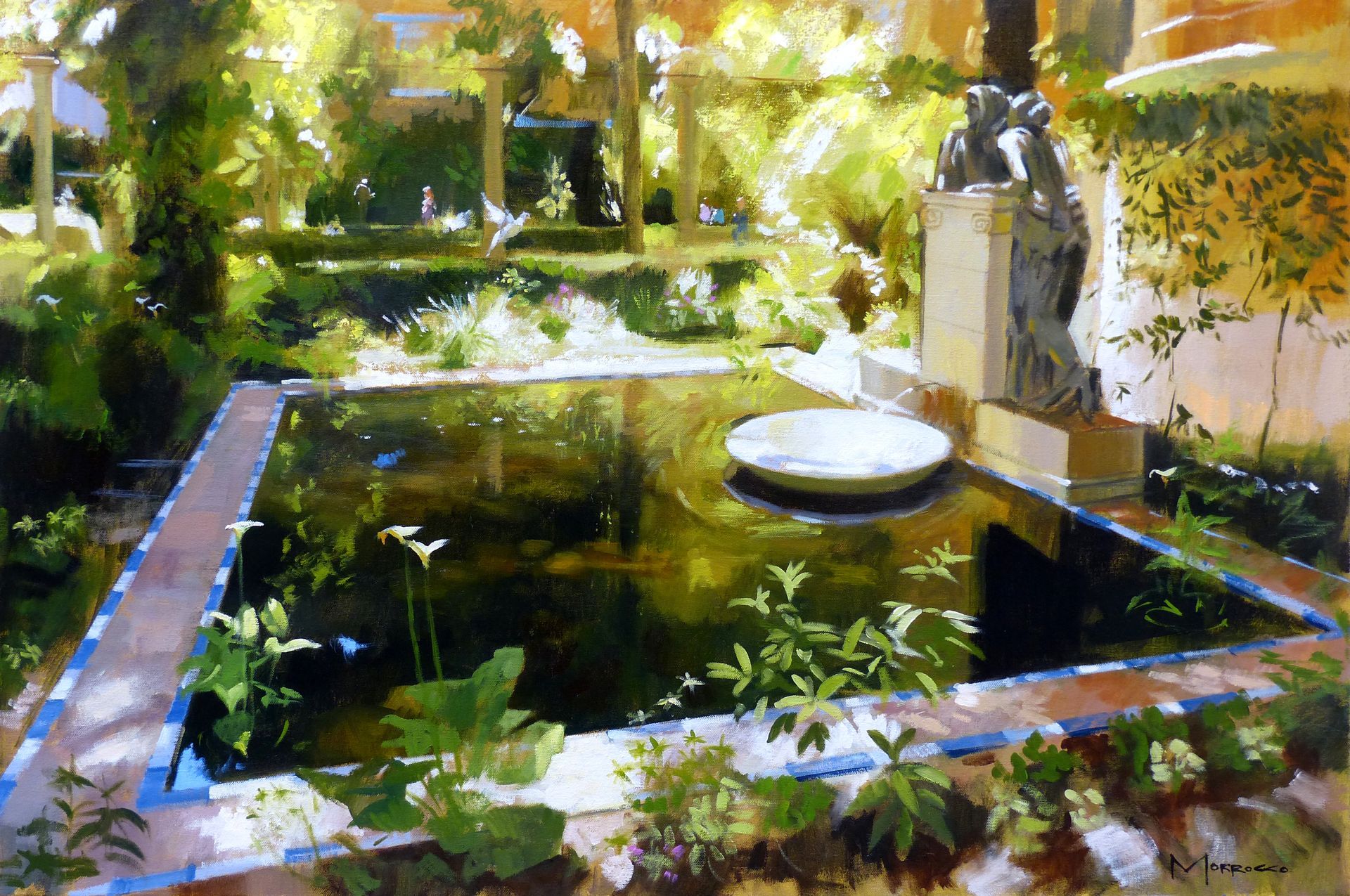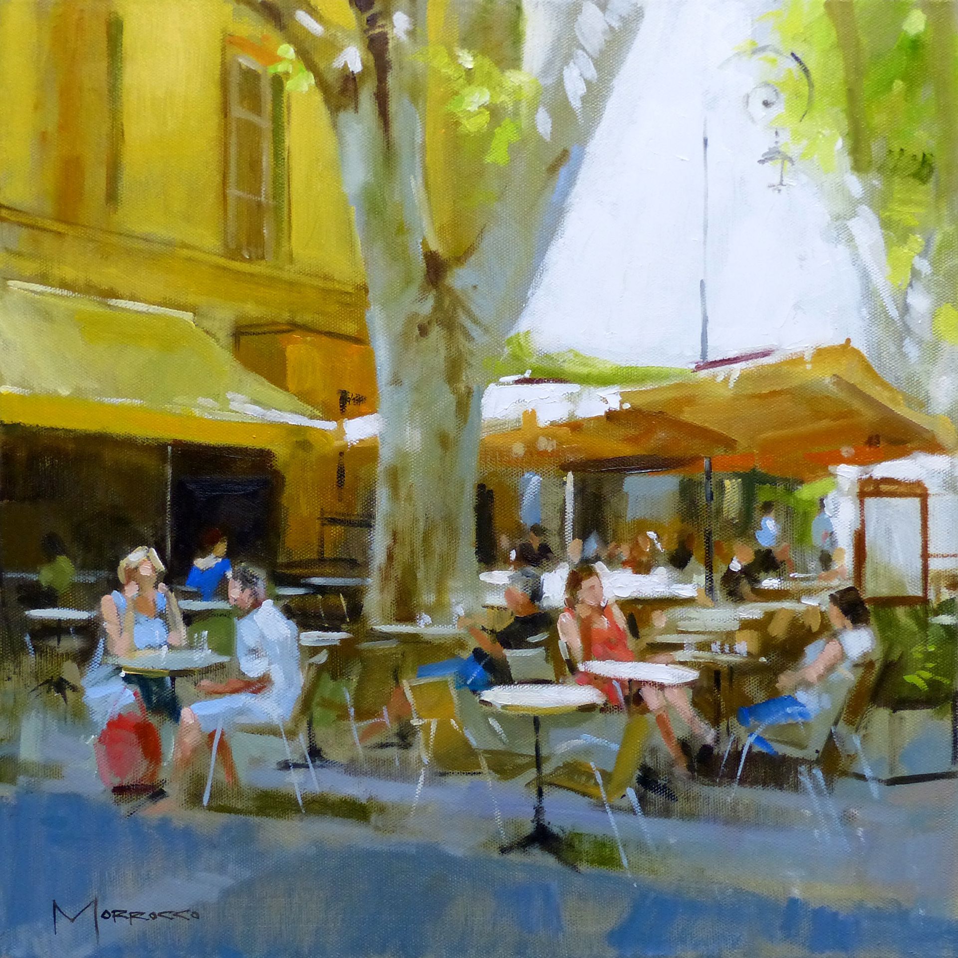 Morrocco is a virtuoso, perfectionist. He communicates his desired moment of observation using classically developed impressionist techniques with blocks of colour, shading and light to represent his scene. His lines are always interesting, which combine with his use of a confident, rich palette, contrasts, textures and perspectives that are designed to lead and stimulate the viewer's eye. Lesser artists will avoid figures in their compositions; however, a sign of Morrocco’s great skill is that he is not afraid to include his anatomically perfect figures to suggest movement and to create an authentic (rather than contrived) representation of the scenes that he chooses to depict.