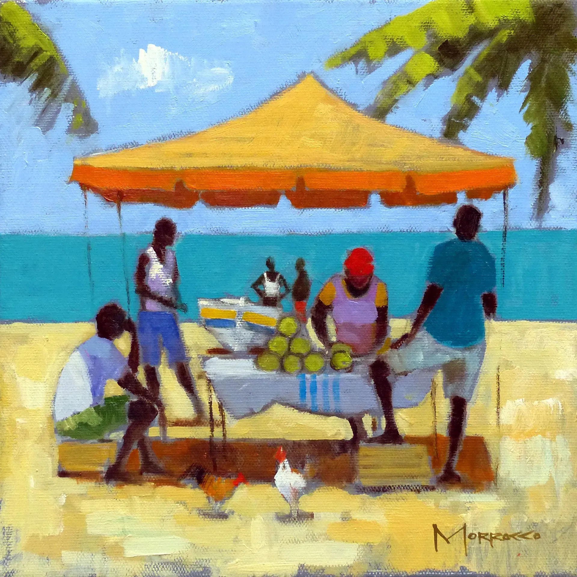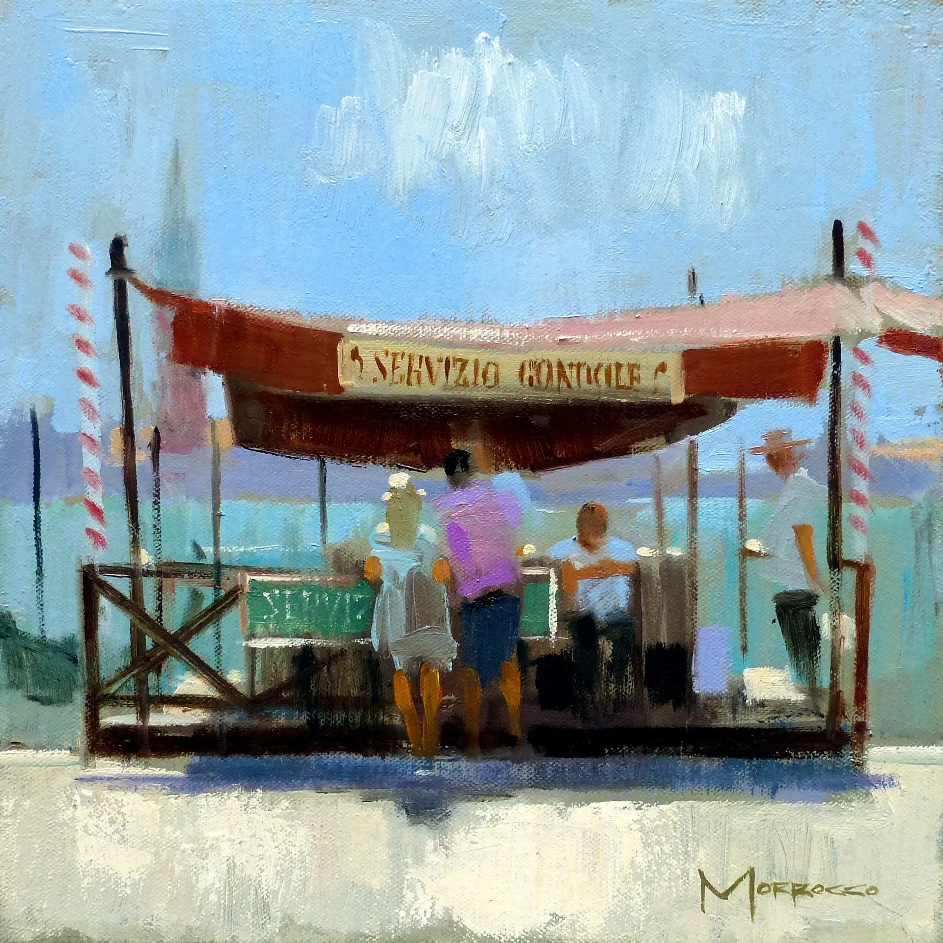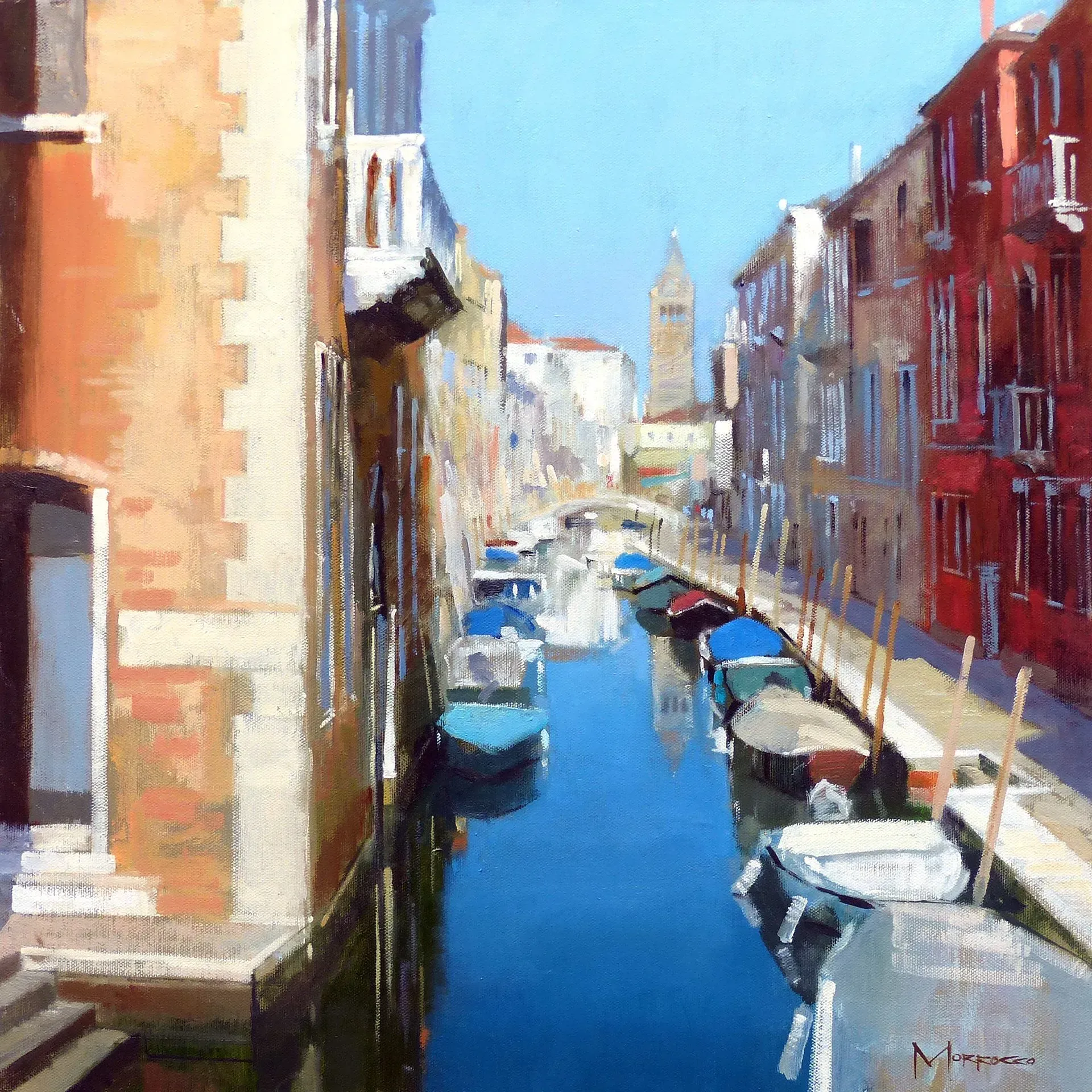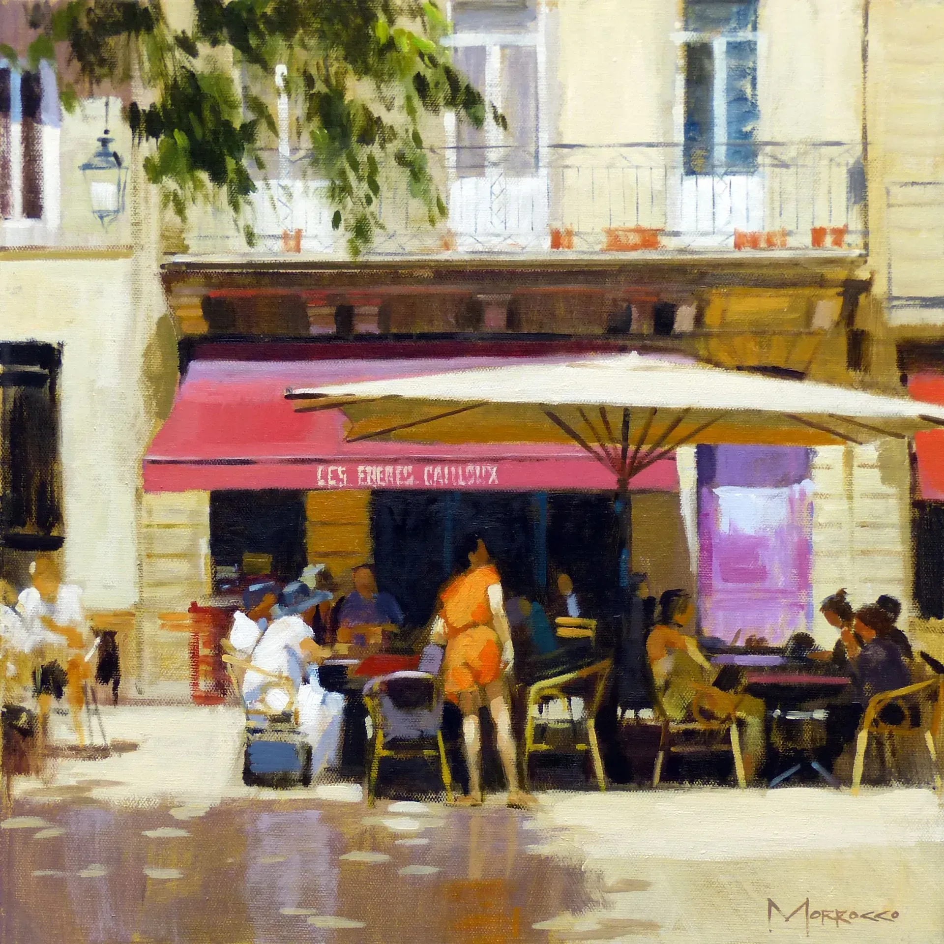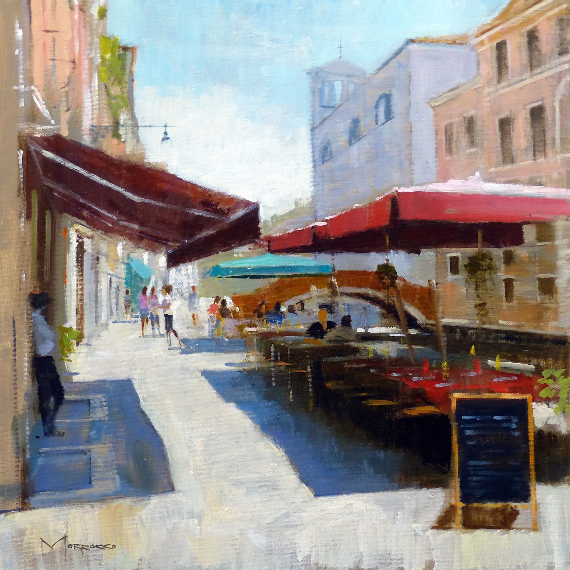Morrocco is a virtuoso, perfectionist. He communicates his desired moment of observation using classically developed impressionist techniques with blocks of colour, shading and light to represent his scene. His lines are always interesting, which combine with his use of a confident, rich palette, contrasts, textures and perspectives that are designed to lead and stimulate the viewer's eye. Lesser artists will avoid figures in their compositions; however, a sign of Morrocco’s great skill is that he is not afraid to include his anatomically perfect figures to suggest movement and to create an authentic (rather than contrived) representation of the scenes that he chooses to depict.