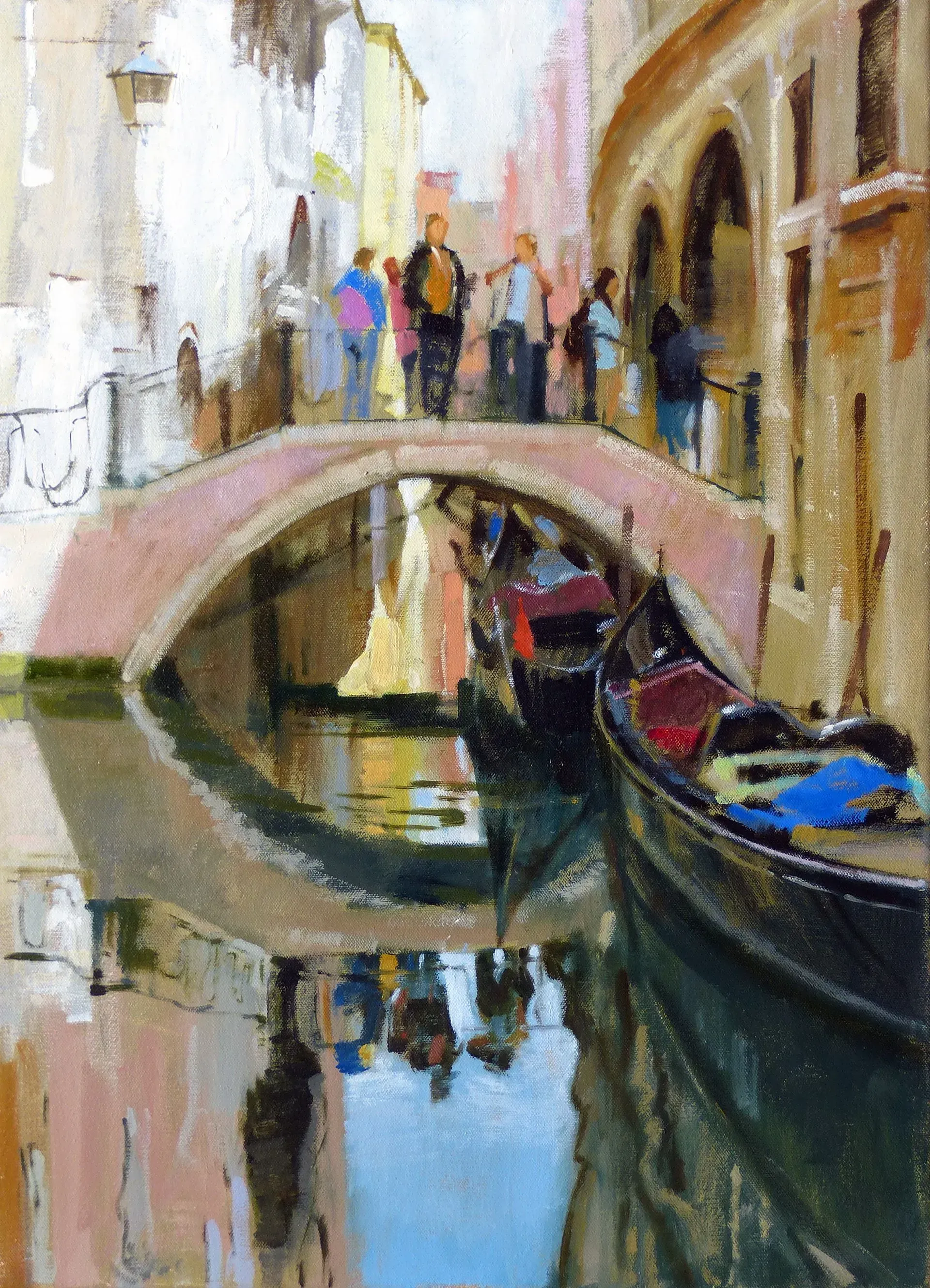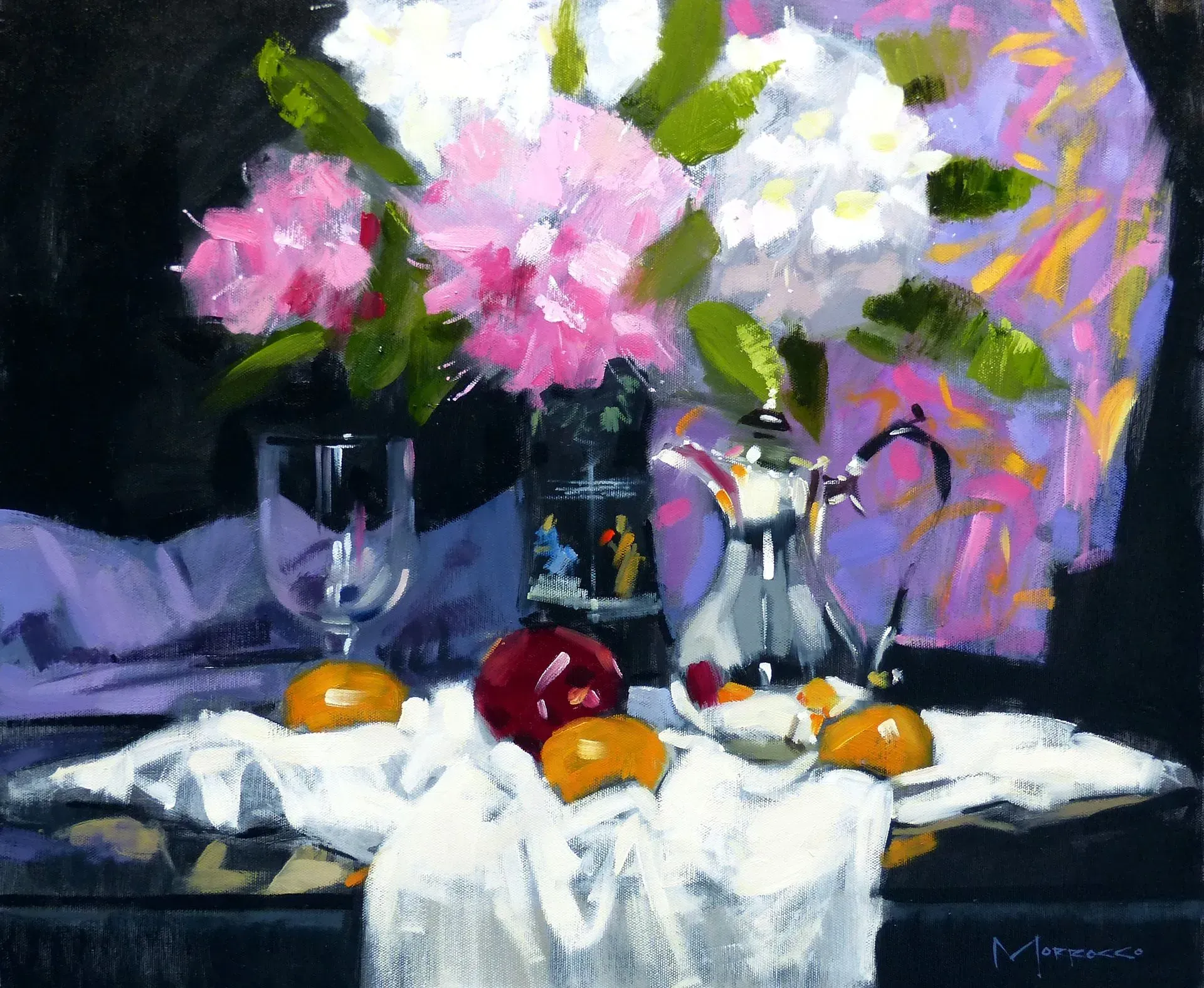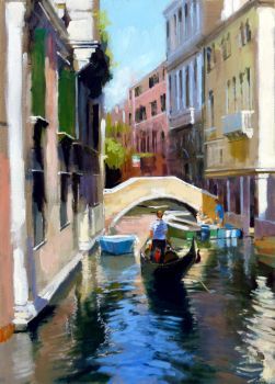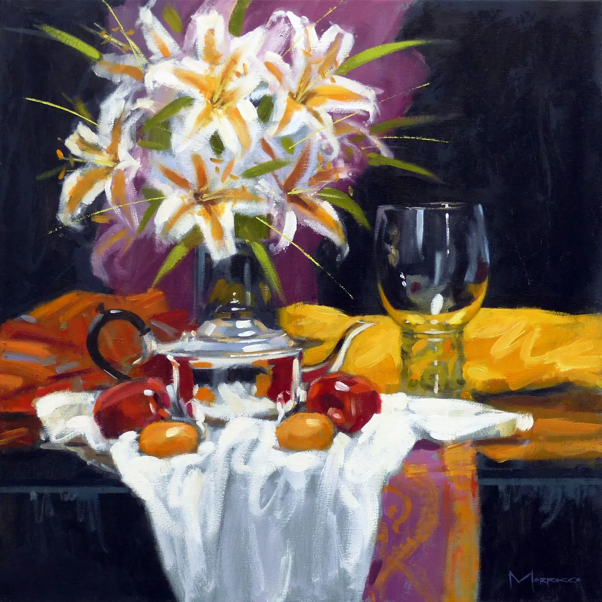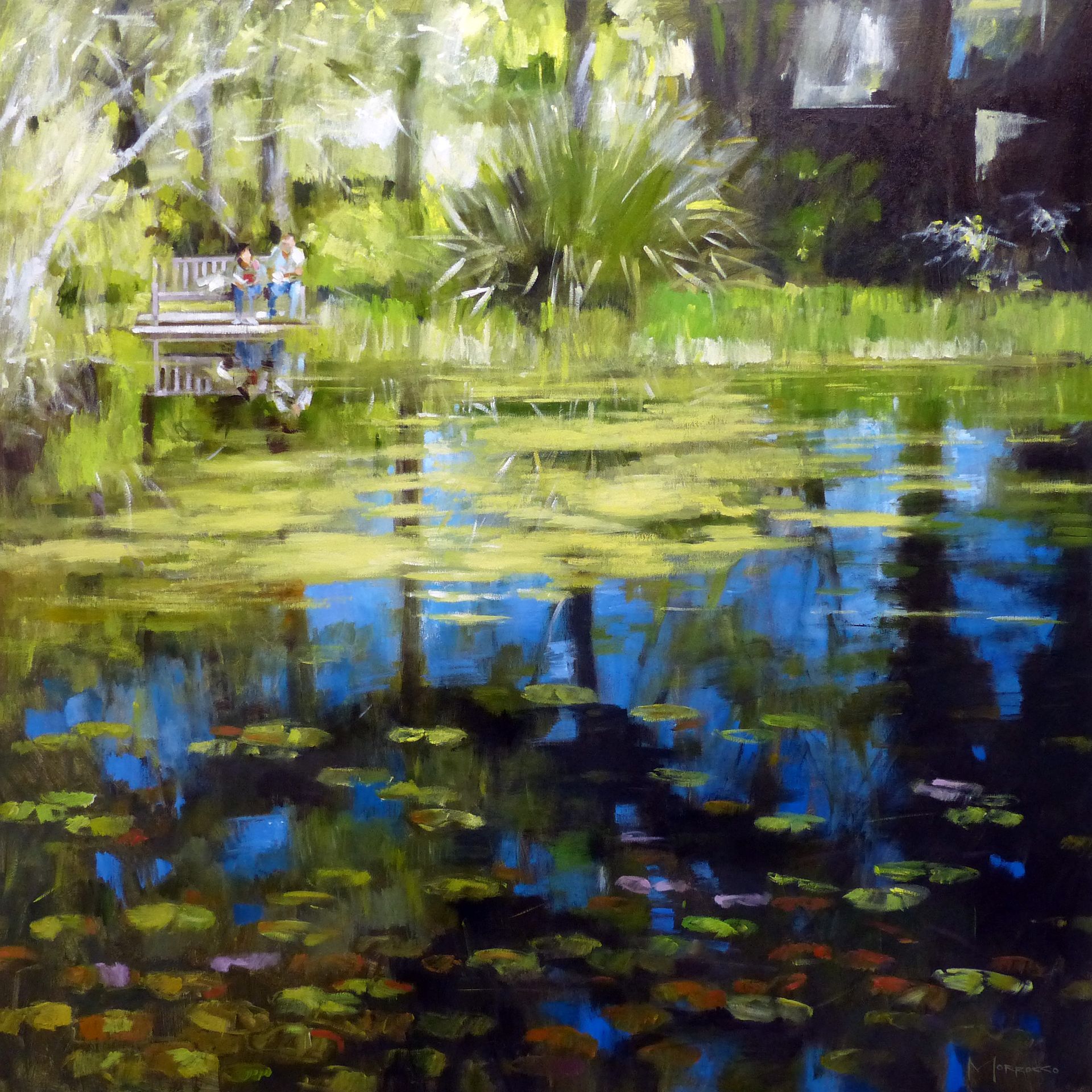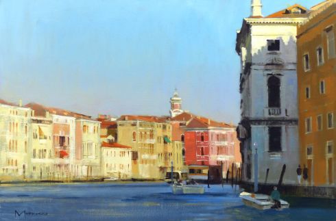 Morrocco is a virtuoso, perfectionist. He communicates his desired moment of observation using classically developed impressionist techniques with blocks of colour, shading and light to represent his scene. His lines are always interesting, which combine with his use of a confident, rich palette, contrasts, textures and perspectives that are designed to lead and stimulate the viewer's eye. Lesser artists will avoid figures in their compositions; however, a sign of Morrocco’s great skill is that he is not afraid to include his anatomically perfect figures to suggest movement and to create an authentic (rather than contrived) representation of the scenes that he chooses to depict.