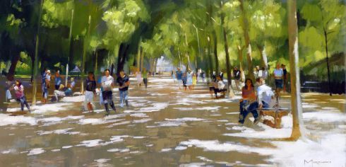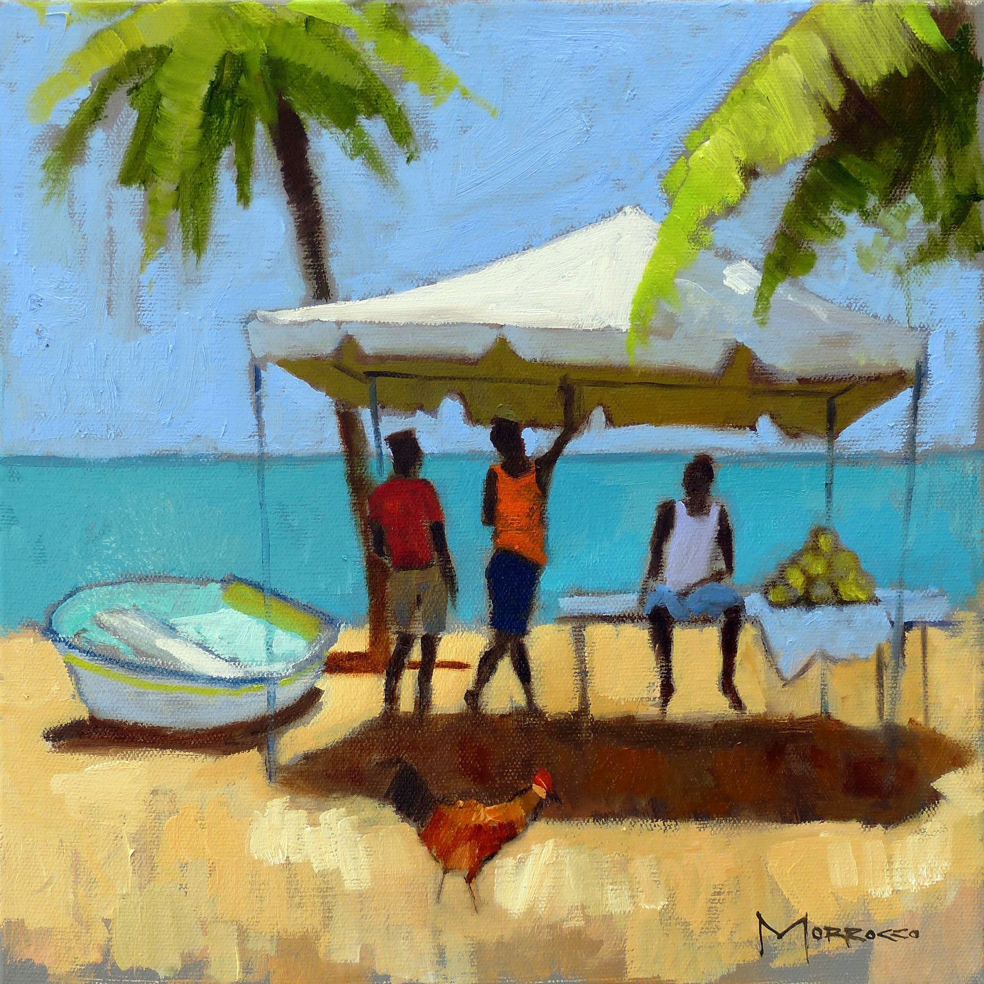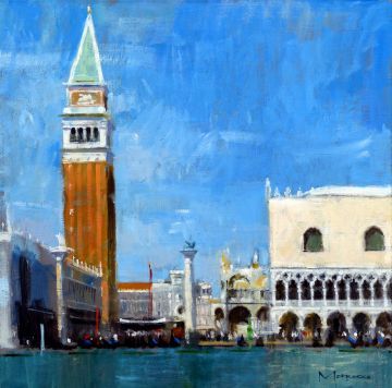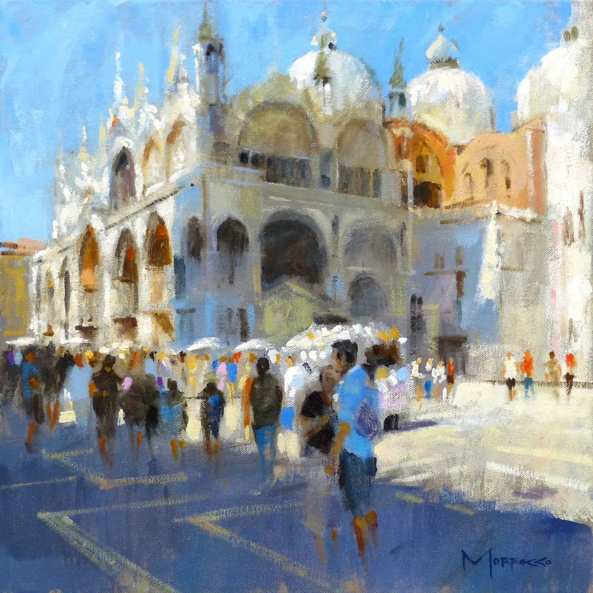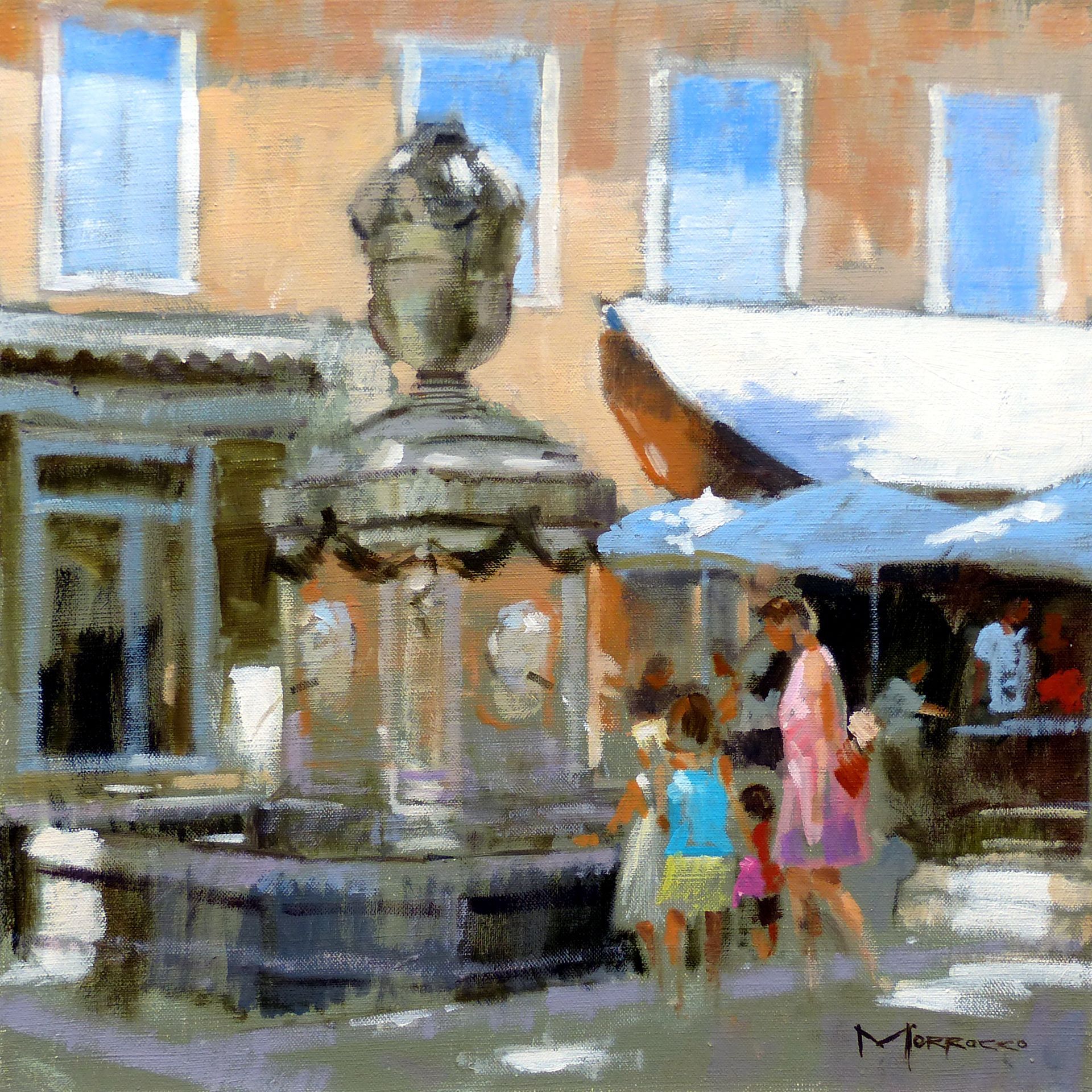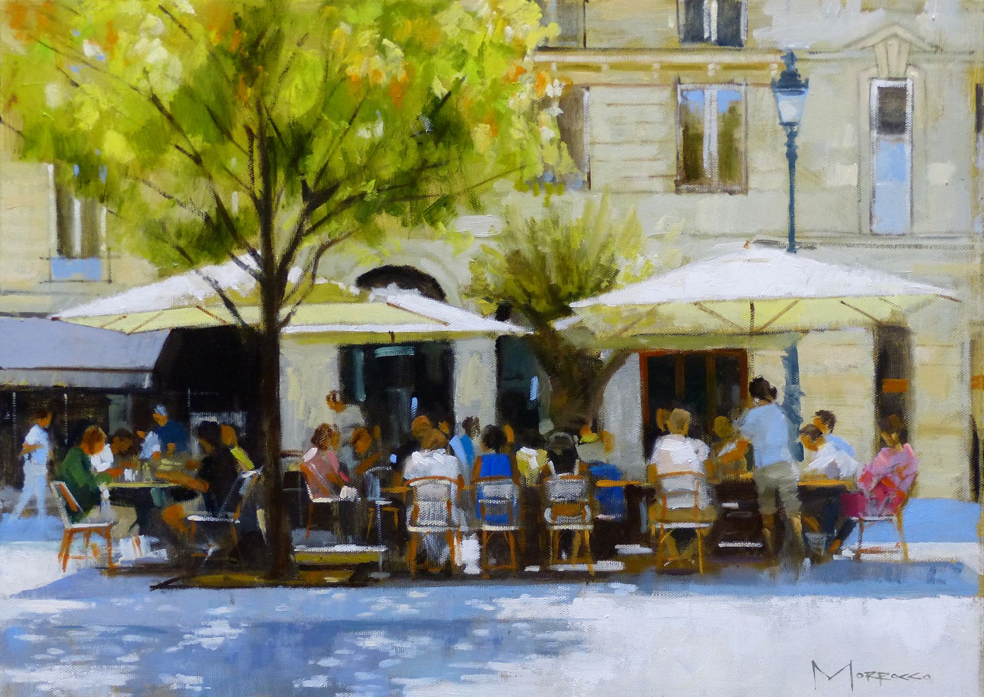 Morrocco is a virtuoso, perfectionist. He communicates his desired moment of observation using classically developed impressionist techniques with blocks of colour, shading and light to represent his scene. His lines are always interesting, which combine with his use of a confident, rich palette, contrasts, textures and perspectives that are designed to lead and stimulate the viewer's eye. Lesser artists will avoid figures in their compositions; however, a sign of Morrocco’s great skill is that he is not afraid to include his anatomically perfect figures to suggest movement and to create an authentic (rather than contrived) representation of the scenes that he chooses to depict.