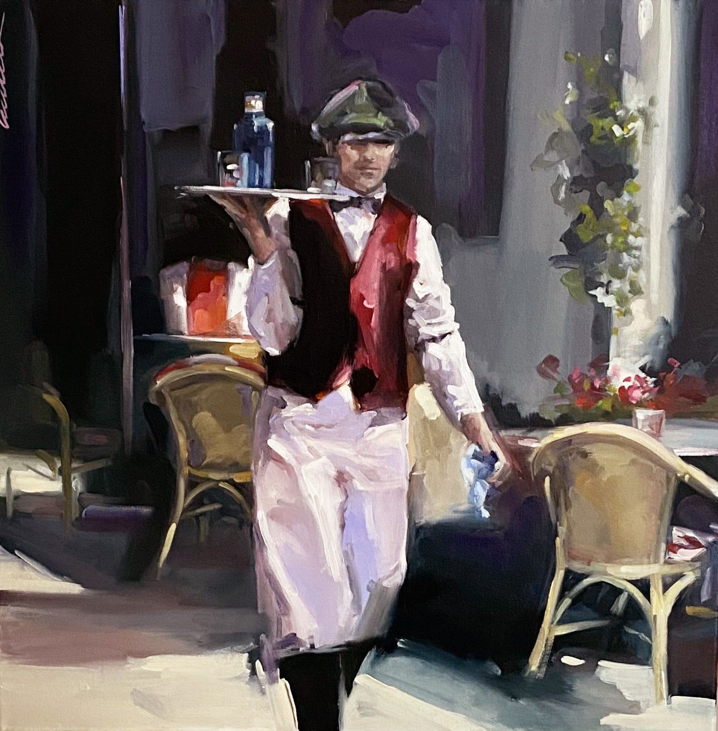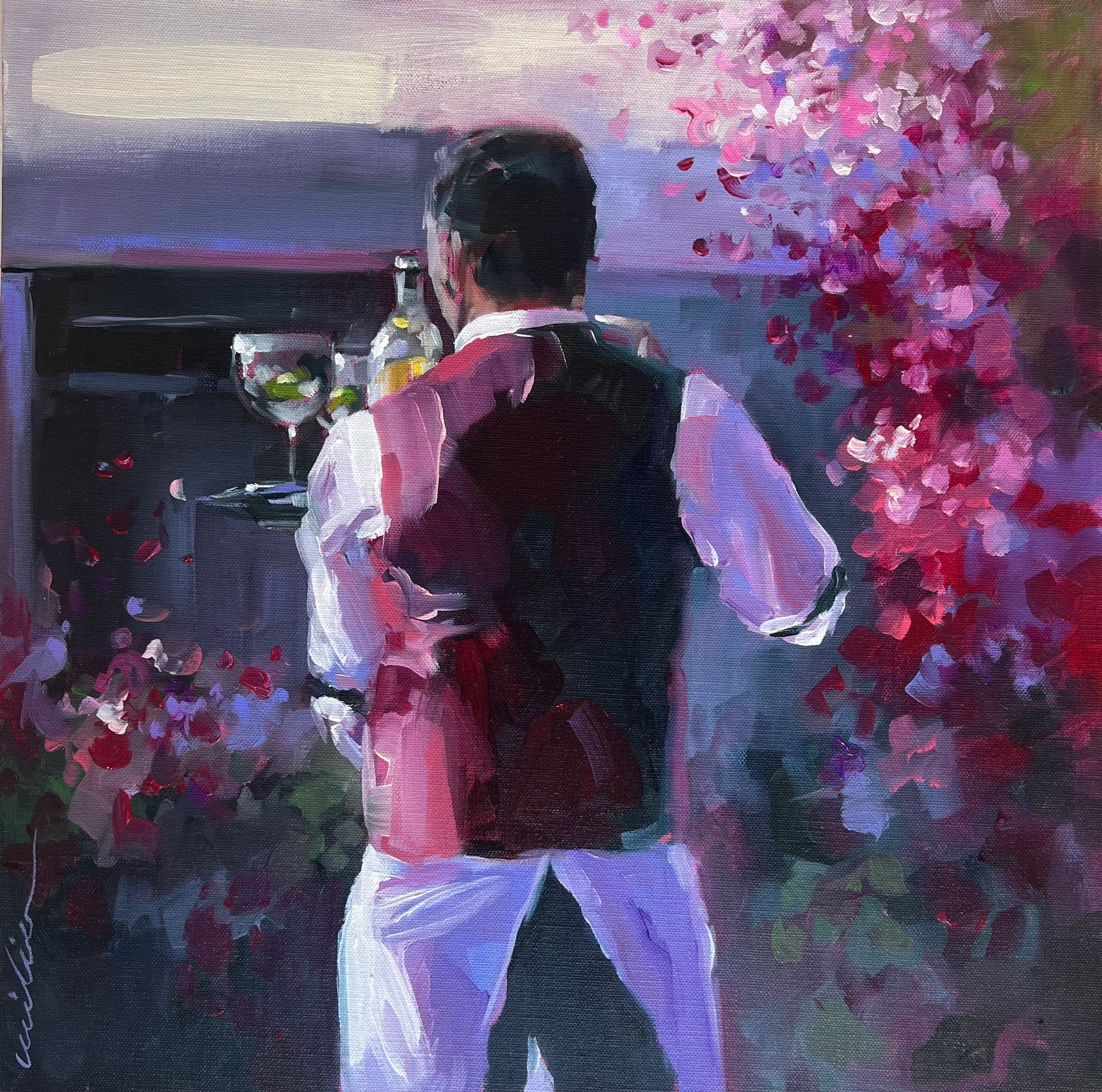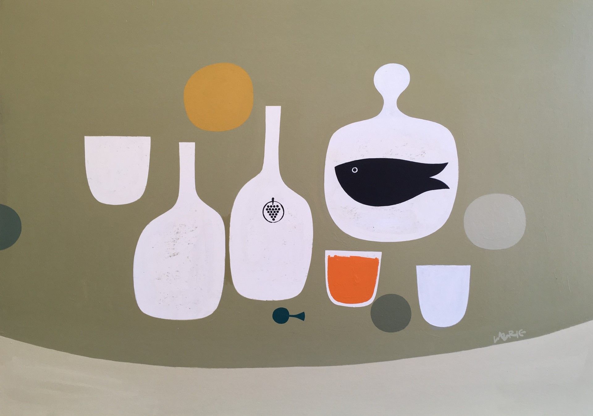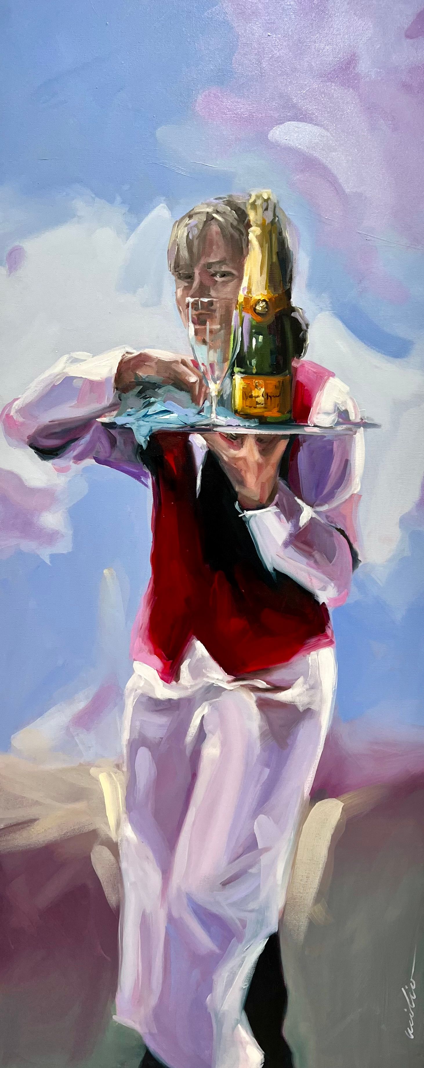 She uses symbols that we associate with times of pleasure such as fruit, cocktails, spirits, wine or a beer and waiters or waitresses.