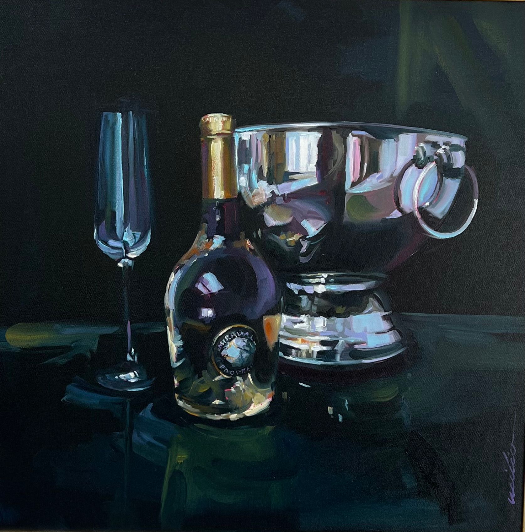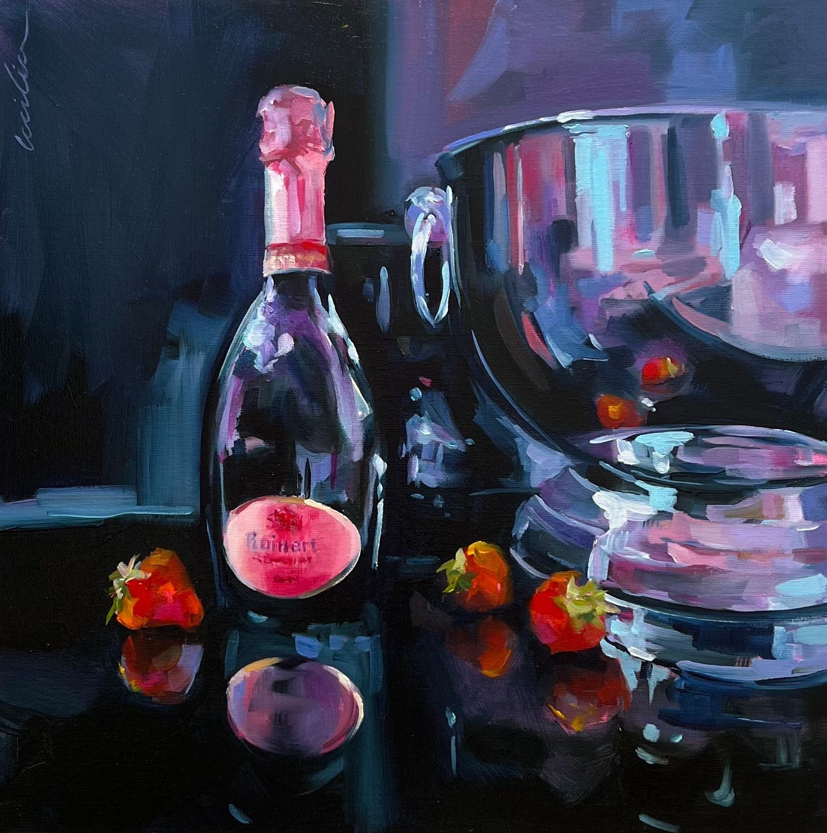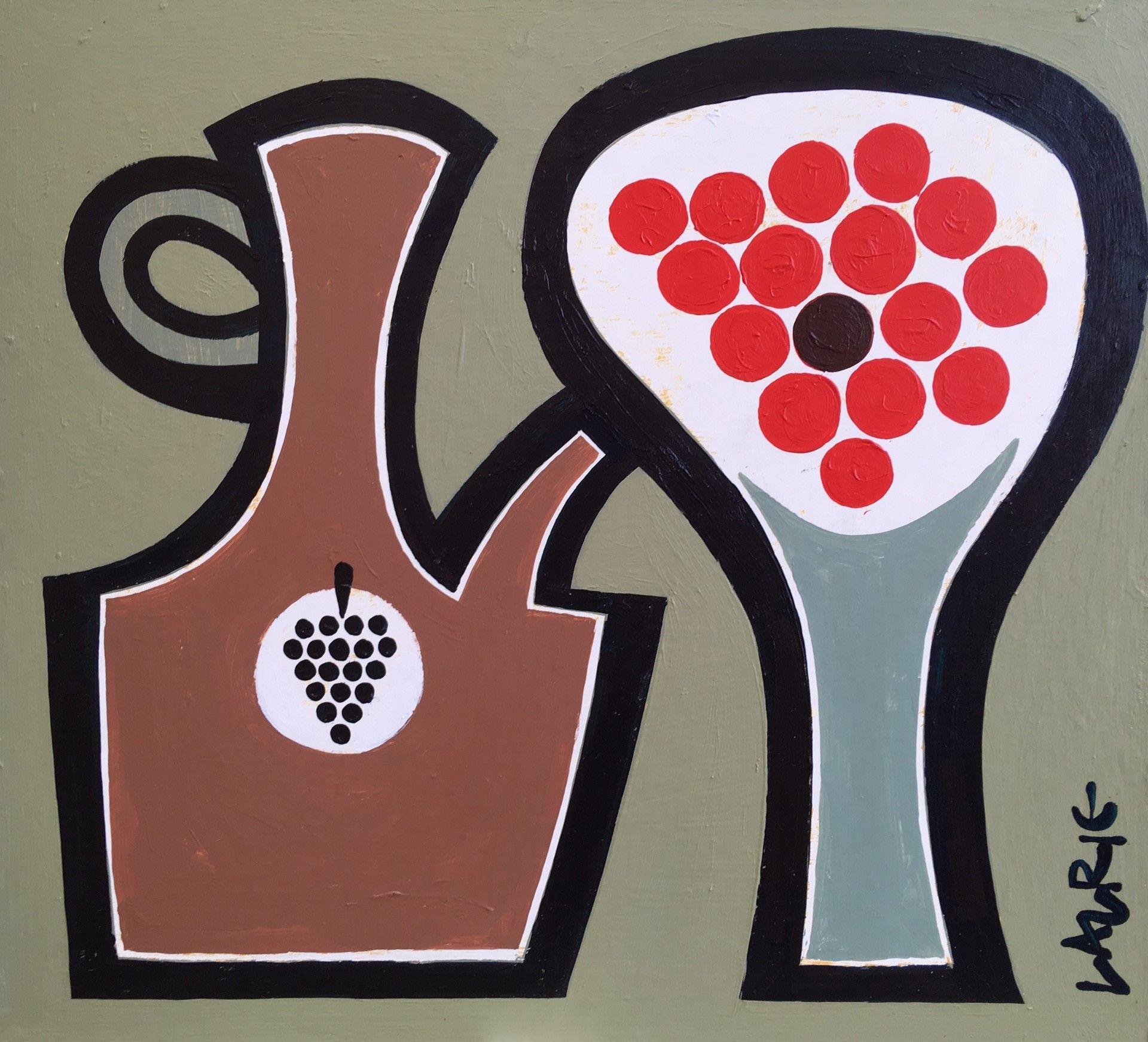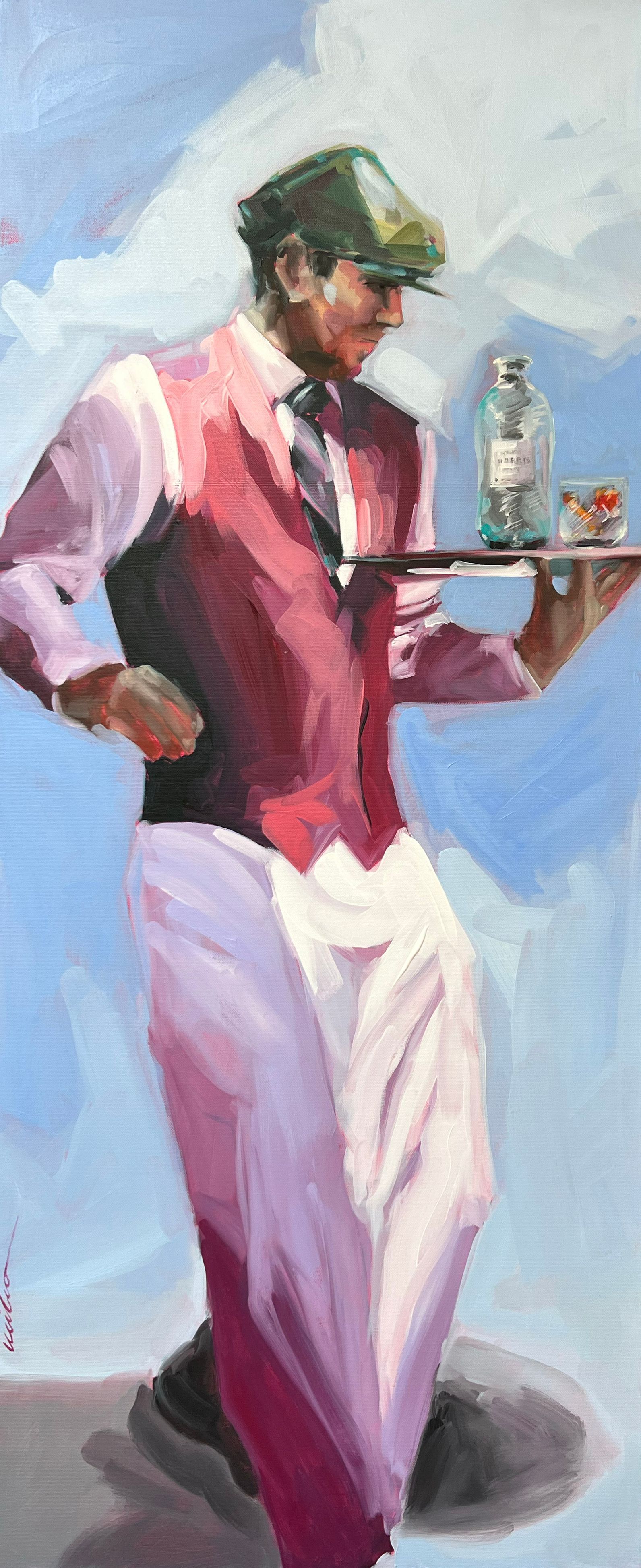 She uses symbols that we associate with times of pleasure such as fruit, cocktails, spirits, wine or a beer and waiters or waitresses.