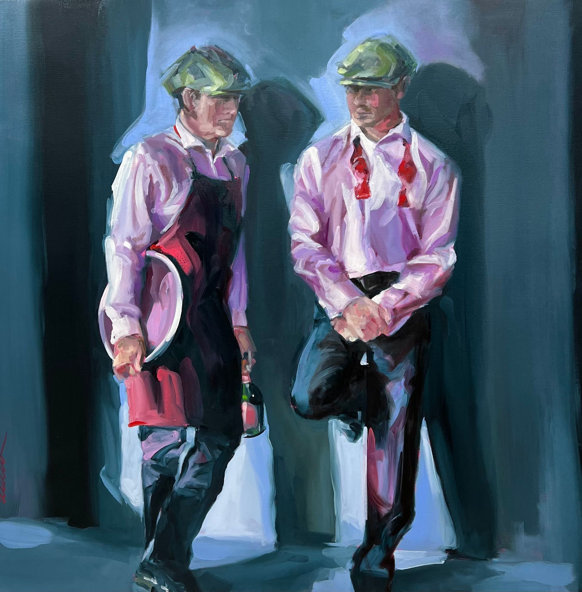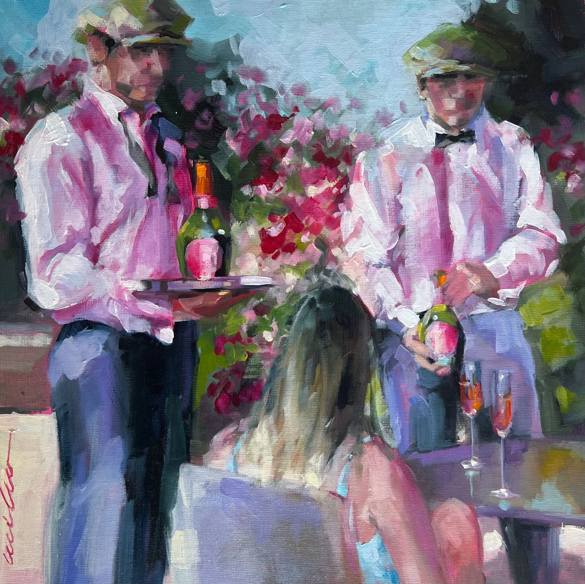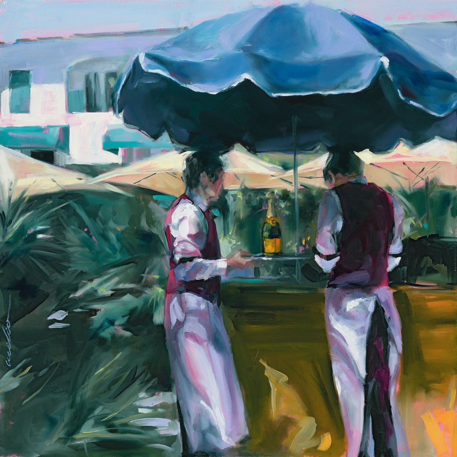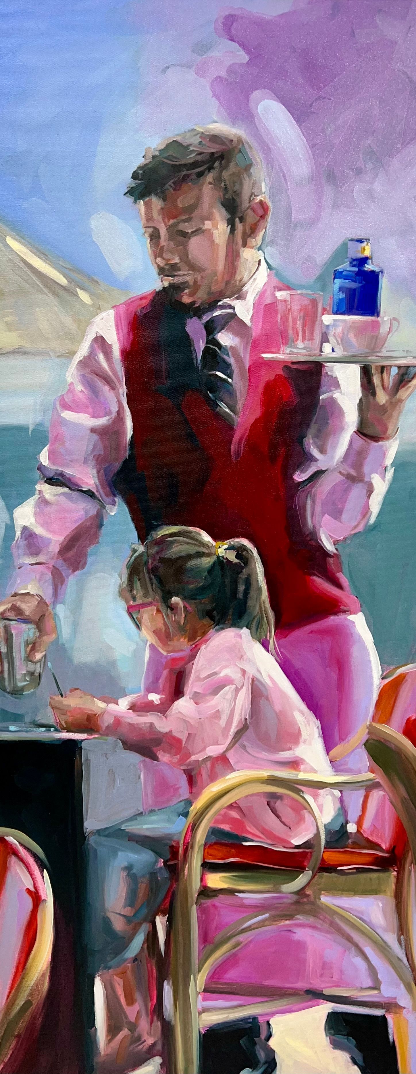 Much of the research and painting preparation for this show was achieved in Majorca (Puerto Pollensa). Hence the brightness, café life and the (holiday-type) focus on relaxing and having fun.